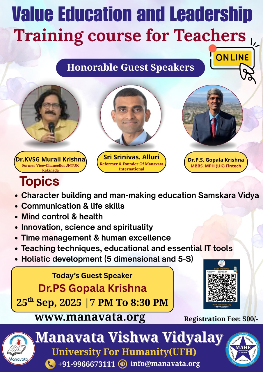 Value Education and Leadership – Training Course for Teachers Date: 19th to 24th September, 2025 Time: 7:00 PM to 8:30 PM (IST)…